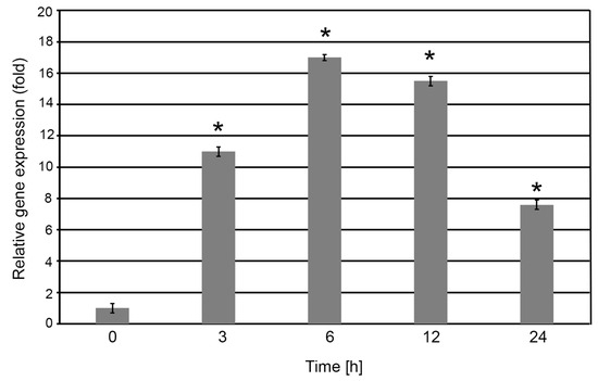 Relative expression of the S2P2 gene in A. thaliana leaves exposed to high light conditions. Four-week-old wild-type A. thaliana plants were subjected to high light intensity (1000 μmol m−2 s−1) for 0, 3, 6, 12, and 24 h. Following treatment, total RNA was extracted from leaf tissues and reverse-transcribed into complementary DNA (cDNA), which was subsequently used as a template for quantitative real-time PCR (qRT-PCR) analysis. Expression level of S2P2 was normalized against the endogenous reference gene CYP5. Asterisks (*) indicate statistically significant changes compared to the 0 h base time value (p < 0.05).