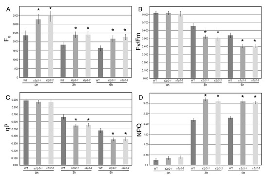 Given that the most pronounced upregulation of S2P2 gene expression occurred within the first 6 h of high light exposure, functional measurements were conducted after 3 and 6 h of treatment at high irradiance (1000 μmol m−2 s−1). Under control light conditions, both S2P2 mutant lines exhibited elevated F0 levels compared to WT plants. During high light exposure, F0 levels remained higher in the mutants, although the relative decline in F0 appeared slightly more pronounced in S2P2 mutant plants than in WT (Figure 4A).
