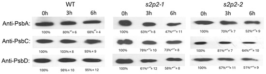 In contrast, a different pattern was observed for PsbD and PsbC polypeptides. While their levels remained relatively stable in WT plants during the high light exposure, both S2P2 mutant lines showed a marked reduction in the abundance of these proteins. After 6 h of stress, PsbD levels in S2P2 mutants had declined to approximately 50% of the initial value, while PsbC content was reduced to 65–70% (Figure 5).