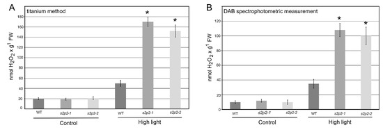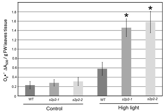 Under non-stress conditions, ROS levels in both WT and S2P2 mutant leaves were low and comparable. However, following a 3 h exposure to high light intensity, ROS accumulation in the S2P2 mutants significantly exceeded that in WT plants. Specifically, the level of superoxide radical in S2P2 mutant leaves was over 60% higher than in WT leaves (Figure 6), while hydrogen peroxide content was more than threefold higher in the mutants compared to WT (Figure 7).