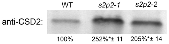 Immunoblot quantification of CSD2 protein in wild-type and S2P2 mutant lines following high light exposure. CSD2 protein levels were analyzed in wild-type A. thaliana (WT) plants and s2p2–1 and s2p2–2 mutant lines after 3 h of exposure to high irradiance (1000 μmol m−2 s−1). Protein extracts from leaf tissues were subjected to SDS-PAGE and immunoblotting using a CSD2-specific primary antibody. Protein concentration in extracts was determined according to the Lowry method. Before hybridization with antibodies, the membranes were transiently stained with Ponceu S to verify the transfer efficiency and control loading. Quantification was based on three independent biological replicates. Data are presented as mean ± standard deviation (s.d.). Asterisks (*) indicate statistically significant differences between mutant lines and the WT control (p ≤ 0.05).