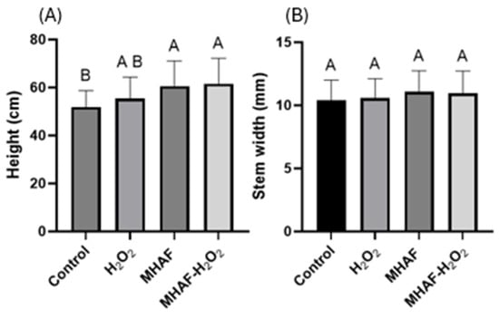 Statistical analysis of morphological variables. (A) Height of C. annuum plants treated with H2O2, MHAF, and MHAF-H2O2, expressed in cm. (B) Stem width of C. annum plants. The data is expressed as mean values. Different letters express statistical differences at α = 0.1; bars in each column indicate standard deviation; and tests were conducted in triplicate.