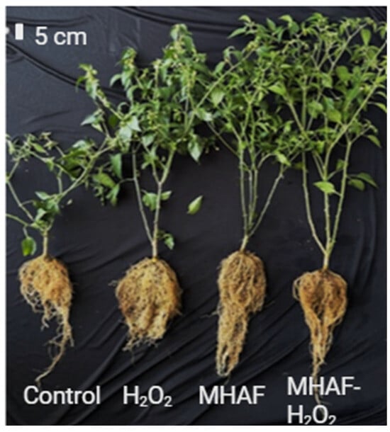 In Figure 2, a general representation of the aerial and root parts of the plants treated with H2O2 and MHAF in single or combined applications is shown.