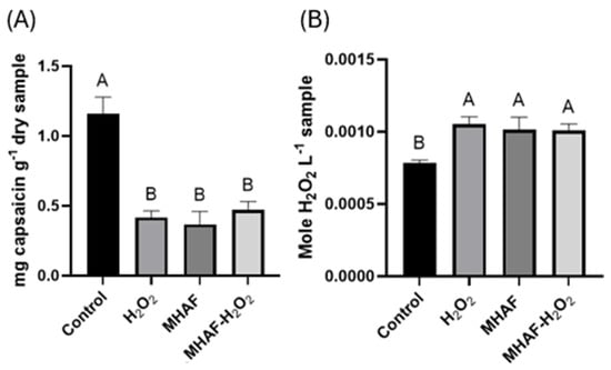 Statistical analysis of capsaicin and H2O2. (A) Capsaicin content from C. annuum fruits, treated with H2O2, MHAF, and MHAF-H2O2. (B) Endogenous H2O2 content from C. annuum leaves, treated with H2O2, MHAF, and MHAF-H2O2. Data are expressed as mean values. Different letters express statistical differences, α = 0.1; bars in each column indicate standard deviation; and tests were conducted in triplicate.