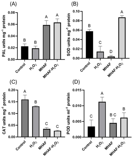 Enzymatic activity from C. annuum leaves treated with H2O2, MHAF, and MHAF-H2O2. (A) PAL activity, (B) SOD activity, (C) CAT activity, and (D) POD activity. Data is expressed as mean values. Within a bar, letters express statistical differences at α = 0.1; bars in each column indicate standard deviation; and tests were conducted in triplicate.