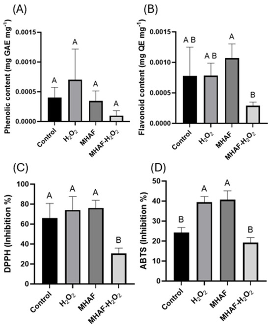Total phenolic content, flavonoid, and antioxidant capacity with DPPH and ABTS assays from C. annuum leaves treated with H2O2, MHAF, and MHAF-H2O2. (A) Phenolic content expressed as mg of gallic acid equivalents per mg of sample. (B) Flavonoid content expressed as mg of quercetin equivalents per mg of sample. (C) The DPPH assay expressed as the inhibition percentage of free radicals. (D) The ABTS assay expressed as the inhibition percentage of free radicals. Data are expressed as mean values. Within a bar, letters express statistical differences at α = 0.1; bars in each column indicate standard deviation; and tests were conducted in triplicate.