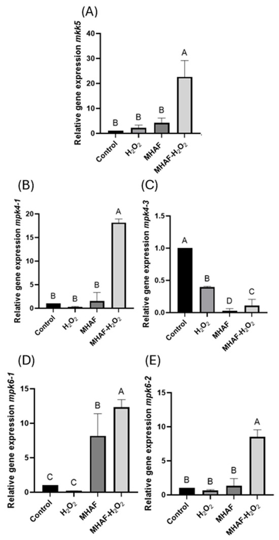 Relative gene expressions of mkk5, mpk4-1, mpk4-3, mpk6-1, and mpk6-2 from C. annuum leaves treated with H2O2, MHAF, and MHAF-H2O2, using actin as a housekeeping gene. (A) mkk5 gene expression. (B) mpk4-1 gene expression. (C) mpk4-3 gene expression. (D) mpk6-1 gene expression. (E) mpk6-2 gene expression. Data is expressed as mean values. Within a bar, letters express statistical differences at α = 0.1; bars in each column indicate standard deviation; and tests were conducted in triplicate.