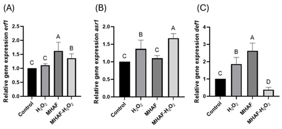 Relative gene expressions of erf1, def1, and asr1 from C. annuum leaves treated with H2O2, MHAF, and MHAF-H2O2, using actin as a housekeeping gene. (A) erf1 gene expression. (B) asr1 gene expression. (C) def1 gene expression. Data is expressed as mean values. Within a bar, letters express statistical differences at α = 0.1; bars in each column indicate standard deviation. Tests were conducted in triplicate.