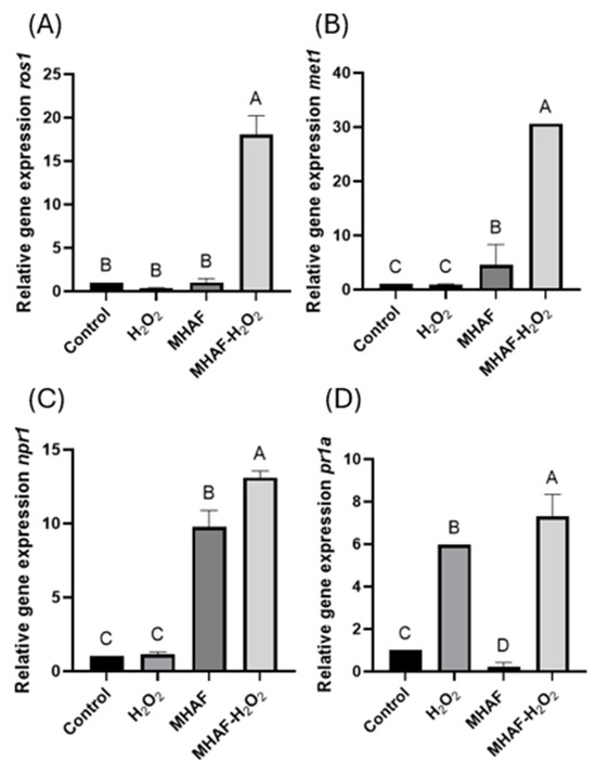 Relative gene expressions of ros1, met1, npr1, and pr1a from C. annuum leaves treated with H2O2, MHAF, and MHAF-H2O2, using actin as a housekeeping gene. (A) ros1 gene expression. (B) met1 gene expression. (C) npr1 gene expression. (D) pr1a gene expression. Data are expressed as mean values. Within a bar, letters express statistical differences at α = 0.1; bars in each column indicate standard deviation.
