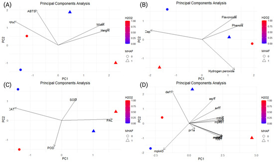 Principal component analysis (PCA) of the H2O2, MHAF, and MHAF+H2O2 treatments with the morphological, biochemical, and molecular variables evaluated in this study. (A) Morphological and antioxidant assays. (B) Phenylpropanoid compounds, capsaicin, and H2O2. (C) Enzymatic essays. (D) Relative gene expressions.