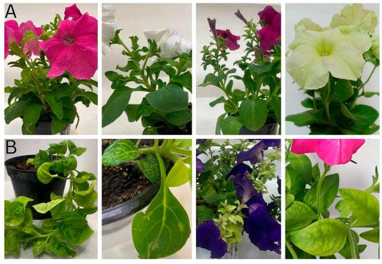 The phenotype of selected asymptomatic (A) and symptomatic (B) petunias collected from the Bulgarian market.