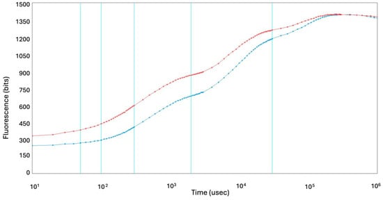 Chlorophyll a fluorescence induction (OJIP) curves were measured on the first fully expanded leaf of five studied plants of each group using a Plant Efficiency Analyzer (Handy-PEA, Hansatech Instruments Ltd., Norfolk, UK). Before measurement, leaf areas were dark-adapted for 40 min using leaf clips. Measurements were taken under 1 s of illumination at 3000 µmol m−2 s−1 PPFD. Data were processed using PEA Plus Software (v1.10) and interpreted following the protocols of Strasser and Strasser [30] and Goltsev and co-authors [31].