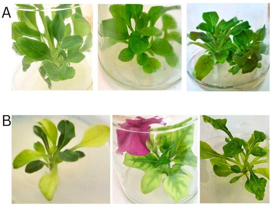 In vitro-derived P. hybrida plantlets: (A) Asymptomatic; (B) Symptomatic plants.
