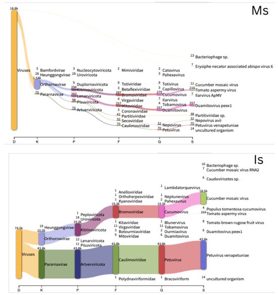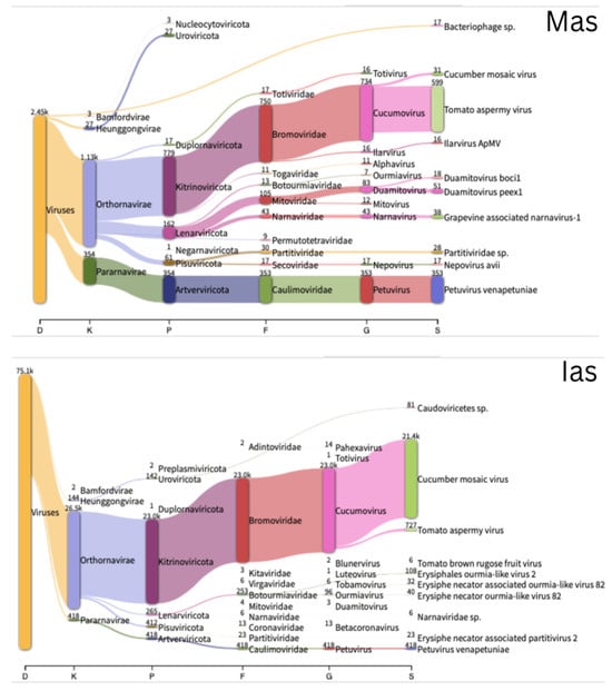 Classification of viral sequences detected in petunia samples illustrated by Sankey diagrams. The classification follows hierarchical taxonomic levels from kingdom to species. Mas = asymptomatic market; Ms = symptomatic market; Ias = asymptomatic in vitro; Is = symptomatic in vitro. In the figure, the virus names were generated automatically by the program according to the Kraken database, so some viruses are represented erroneously by their non-italicized species names; petunia vein clearing virus (PVCV) is represented as Petuvirus venapetuniae.