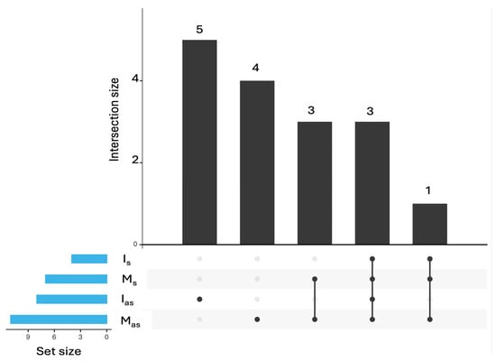 UpSet plot showing shared and unique viruses across symptomatic and asymptomatic petunia samples from different sources. Mas = asymptomatic market; Ms = symptomatic market; Ias = asymptomatic in vitro; Is = symptomatic in vitro.
