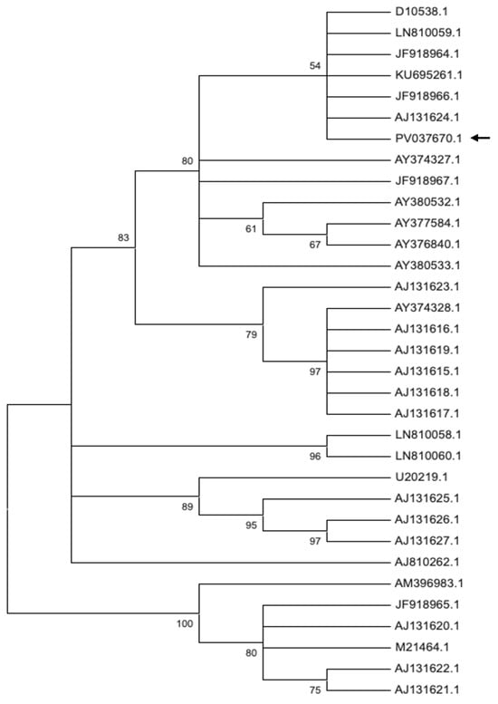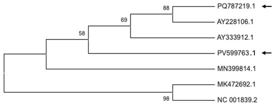The phylogeny of Bulgarian petunia vein clearing virus isolates from P. hybrida. The phylogenetic tree was constructed using Maximum Likelihood method and Tamura–Nei model based on 7 nucleotide sequences with 654 positions of the polyprotein gene in the final dataset. Evolutionary analyses were conducted in MEGA12. The percentage of replicate trees in which the associated taxa clustered together (1000 replicates) is shown next to the branches. The arrows indicate the analyzed Bulgarian accessions available in NCBI GenBank.