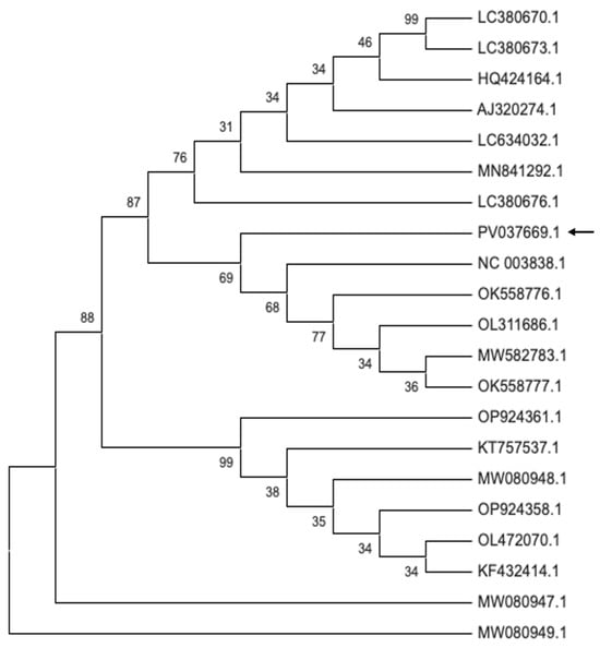 Molecular phylogenetic analysis of Bulgarian tomato aspermy virus isolates from P. hybrida. The phylogenetic tree was constructed using Maximum Likelihood method and Tamura–Nei model based on 21 nucleotide sequences with 947 positions of the RdRp gene in the final dataset. Evolutionary analysis was conducted in MEGA12. The percentage of replicate trees in which the associated taxa clustered together (1000 replicates) is shown above the branches. The arrow indicates the analyzed Bulgarian accession available in NCBI GenBank.