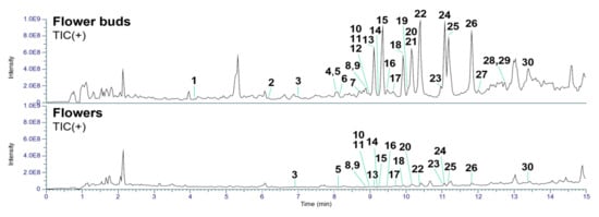 Total ion chromatograms in positive ion mode of the flower buds and flowers of D. odora.