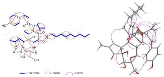 Key 1H–1H COSY, HMBC, and NOESY correlations for compound 16.