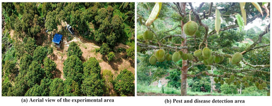 In order to study the characteristic distribution characteristics of the full life cycle of durian pests and diseases, the experimental data of this study were obtained as pictures by high-definition cameras in Area A of a durian base in Penang, Malaysia. Figure 1 shows the collection area of durian pest and disease images.