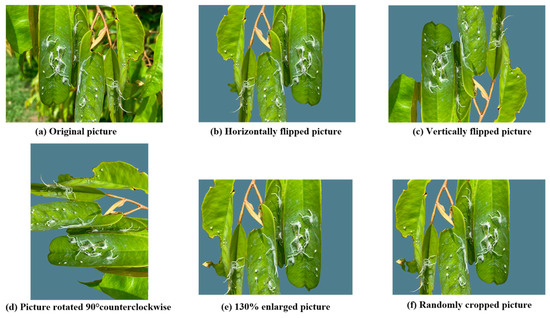The resolution of the original pictures is too high. If the training data is used directly, the computing and storage resources required exceed the endurance limit of the existing deep learning system. All pictures are cropped and normalized to ensure that the pest and disease area is close to the center of the pictures. The resolution of each picture is 640 × 480 (480 p). Before training, this study performed enhancement operations on the data set in order to increase the amount of data and enhance the generalization ability of the model. The data enhancement includes operations such as flipping, rotating, scaling, cropping, and shifting. This study also uses the random division to divide the augmented data set into a training set and a test set at a ratio of 8:2. The cross-validation method is used and repeated 5 times randomly [16]. Taking the durian psyllid as an example, Figure 2 shows the data enhancement operation of the durian psyllid.