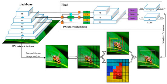 YOLO-v8 (You Only Look Once, version 8) is the latest version of the YOLO algorithm series, focusing on real-time object detection and image recognition [17]. It uses a more optimized neural network architecture to increase the width and depth of the network and introduces the Transformer architecture into the feature extraction part so that the model can capture more image details and contextual information, thereby improving the detection accuracy. It includes two modules: backbone and head. The backbone combines multiple convolutional layers and residual blocks to effectively extract multi-scale features in images; its residual blocks solve the common gradient vanishing problem in deep networks through jump connections, ensuring the trainability and stability of deep networks. Head uses FPN (Feature Pyramid Network) and PANet (Path Aggregation Network) structures. FPN fuses upper-layer features (deep networks, features with weak spatial sense but strong semantics) into shallow network features (features with strong spatial sense but less semantics). PANet introduces a bottom-up path to transmit and fuse the more accurate position signals of the shallow network into the deep features. The above two structures enable the effective fusion of features from different scales, which enhances the performance of the model in detecting objects of different sizes. Figure 3 shows the YOLO-v8 recognition process of pests and diseases.