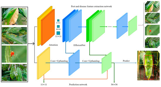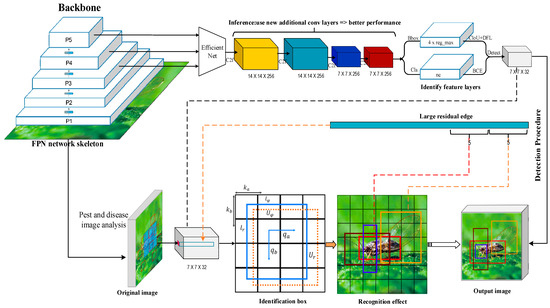 In Equation (5), (, ) represents the upper left corner coordinate of the small grid in the feature layer. In YOLO, the width and height of each small grid in the feature layer are 1. (, ) represents the width and height of the preset a priori frame mapped to the feature layer. w and h represent the size of the feature layer, and the final box coordinates are (, , , ). Figure 6 shows the pest and disease identification process of the EN-YOLO algorithm. Its core modules include the following.