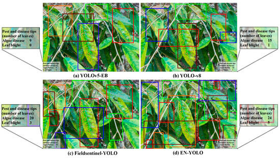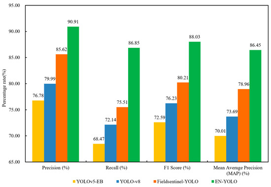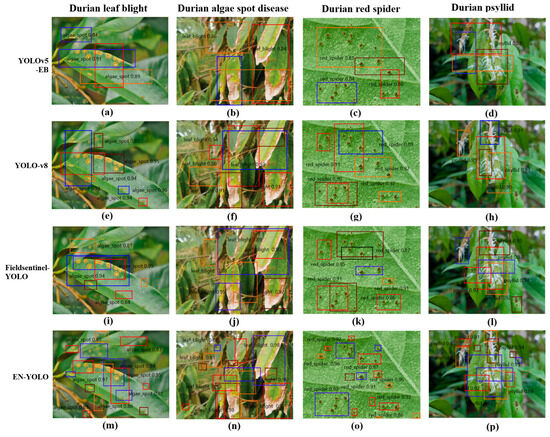 In order to compare the performance of the EN-YOLO model, this study compared it with the YOLOv5-EB [26], YOLO-v8 [27], and Fieldsentinel-YOLO [28] models. Fieldsentinel-YOLO is a lightweight model designed for field crop disease detection. It offers excellent edge deployment performance and is suitable for mobile devices in orchard environments. YOLOv5-EB (Edge-Balanced) is a recently developed embedded, optimized version with a small model size and fast inference speed, making it suitable for resource-constrained scenarios. Due to the characteristics of pest and disease detection in durian orchards, such as dense small objects, severe occlusion, and complex backgrounds, these two models were selected as representative solutions for a horizontal comparison in real-world deployment scenarios.