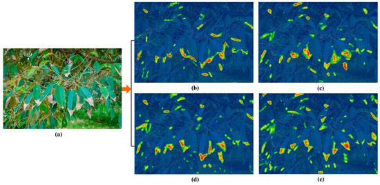 In view of the scale characteristics of durian pests and diseases, this study proposes an improved solution to remove the 28 × 28 intermediate feature layer. Table 8 shows the comparison results of the feature layer configuration of each model. The above experimental results show that the AP of the EN-YOLO algorithm increases by 3.1% after removing the intermediate 28 × 28 layer, indicating that there is feature redundancy in the durian orchard scene at this scale. It can be seen from the feature heat map visualization that the 28 × 28 layer has an over-response to the background vegetation texture. The EN-YOLO algorithm retains the 14 × 56 combination to meet the detection needs of leaf spots (large targets) and red spiders (small targets), and its F1-score increases by 2.7% and 4.1%, respectively; finally, the removal of the 14 × 14 layer by the EN-YOLO algorithm leads to a significant decrease in the AP of large targets, while the removal of the 56 × 56 layer increases the missed detection rate of small targets by 12.6%. This verifies the rationality of retaining the two extreme scales.