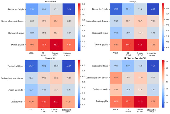 The YOLO-v8 model is used as the ablation experiment object during the training process. Two optimization strategies, CF (context fusion) and K-means, are set to compare with the EfficientNet network optimization strategy [29]. Table 4 shows the ablation test results of four models. The Precision, Recall, F1 and MAP of the EfficientNet + YOLO model are 92.00%, 84.87%, 88.41% and 81.87%. Compared with another three models, it increases by 16.13%, 8.16% and 9.11% in Precision; it increases by 20.79%,9.69% and 12.22% in Recall; it increases by 19.96%,9.46% and 11.90% in F1 value; and it increases by 32.84%,7.91% and 12.55% in MAP. This study also calculated the Precision, Recall, F1 and AP performance of four pests and diseases (fusarium wilt, algae spot, red spider mite and psyllid). Figure 9 shows the performance of various model indicators after ablation of four models, which shows that the EfficientNet + YOLO model has better pest and disease recognition performance than the other three models. It also shows that introducing EfficientNet to optimize the YOLO-v8 model can improve its Precision, Recall, F1 and AP, enabling it to better detect small pests and diseases in the complex durian orchard background. This multi-scale feature fusion technology significantly reduces misjudgments and background noise interference, further improving the overall performance of the model. Figure 9 shows the confusion matrix analysis results after the ablation experiment of the four models.