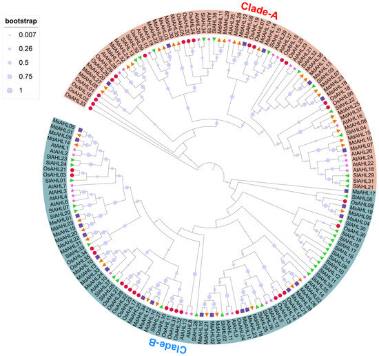 Using Pfam and SMART, we identified protein sequence domains for 29 candidate genes, excluding those without the RGRP motif. Ultimately, 25 apple AHL protein sequences were identified from the M. sieversii genome (Table S1). Using the ProtParam tool, we analyzed the physicochemical properties of the proteins encoded by these 25 genes (Table S1), revealing significant differences among various AHL protein sequences. The amino acid length ranged from 195 to 554 aa, with most sequences falling between 310 and 380 aa. Protein molecular weight ranged from 19.17 to 58.53 kDa. Isoelectric points varied from 4.67 to 10.09, with seven proteins having an isoelectric point below 7, indicating acidity, while the rest had an isoelectric point above 7, indicating alkalinity. Most apple AHL protein instability indices were greater than 40, except for MsAHL19 (39.49). The average hydrophilicity of the proteins ranged from −0.690 to 0.043. Predicting their functions in the apple genome database revealed that most apple AHL proteins, in addition to containing the conserved RGRP motif, also have PPC domains. Subcellular localization predictions showed that all AHL genes are located in the nucleus. Additionally, we constructed a phylogenetic tree through multiple sequence alignment for 37 Malus domestica var. ‘Golden Delicious’, 29 Arabidopsis, and 35 rice AHL proteins, as well as 39 tomato sequences (Figure 1). The results indicated significant differences in clustering between M. sieversii and apple AHL family proteins. In Clade-A, there were eighteen apple AHL proteins compared to only five M. sieversii proteins, suggesting that apple AHL proteins have evolved more functionally similar AHL proteins relative to M. sieversii. Furthermore, 10 MsAHL members clustered with 15 Arabidopsis AHL Clade-B subfamily members, which can be classified into Subgroup I. Nine M. sieversii MsAHL members clustered with fourteen Arabidopsis AHL proteins (Clade-A), showing closer kinship and belonging to Subgroup II. Overall, M. sieversii proteins exhibit more conservative evolution.