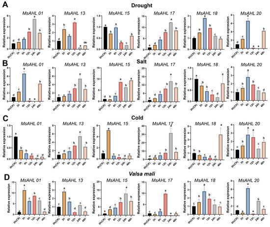 Quantitative expression of six MsAHLs genes under biotic and abiotic stresses. (A) Response of MsAHLs to drought stress. (B) Response of MsAHLs to salt stress. (C) Response of MsAHLs to cold stress. (D) Response of MsAHLs to Valsa mali. Apple seedlings were treated with PEG6000, NaCl, low temperature (4 °C), and Valsa mali, respectively. Samples were harvested at the indicated time points. Color-coded bars depict gene expression profiles in untreated controls versus various treatment time points. Results were normalized against the expression of Actin as an internal control. Values are means ± SD (n = 3). Different letters above the columns indicate significant differences (p ≤ 0.05). CK, control.