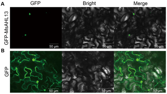 Given the distinct expression patterns observed under stress treatments, MsAHL13 was identified as a candidate for subsequent characterization. Agrobacterium-mediated transient expression of pMCAMBIA1302-MsAHL13-GFP and the pMCAMBIA1302-GFP empty vector was performed in tobacco leaves. Observation under a laser confocal microscope (Figure 6) revealed that the green fluorescence of the pCAMBIA1302-GFP empty vector was distributed throughout the entire cell (Figure 6B), whereas the green fluorescence of the pCAMBIA1302-MsAHL13 fusion protein expression vector was specifically localized in the nucleus, indicating that MsAHL13 is localized in the nucleus (Figure 6A).