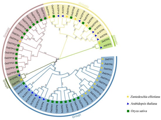 Phylogenetic tree of STP proteins in O. sativa, A. thaliana, and Z. elliottiana. Different-colored branches represent different groupings, while different-shaped patterns represent different species.