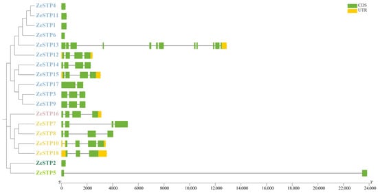Gene structure of the ZeSTP family in Z. elliottiana. The green boxes, yellow boxes, and black lines represent coding sequences, non-coding regions, and gene lengths, respectively. Different-colored branches represent different groupings within the phylogenetic tree of the ZeSTP gene family.