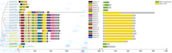 Distribution of conserved motifs and domains in the ZeSTP family of Z. elliottiana.