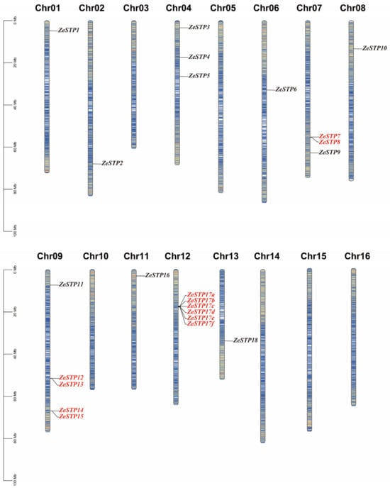 To investigate the replication of the STP gene family in the genome of Z. elliottiana, a chromosomal distribution map of the STP gene family was created based on the chromosomal positions of the genes provided in the annotation file. The results showed that the distribution of ZeSTP genes across the 16 chromosomes is not uniform (Figure 4). ZeSTP genes are mainly concentrated on chromosomes 1, 2, 3, 4, 6, 7, 8, 9, 11, 12, and 13 (Figure 4), while the remaining six chromosomes do not contain any ZeSTP genes. Additionally, ZeSTP genes on chromosomes 1, 4, 6, 8, 11, and 12 are predominantly located at the upper ends of the chromosomes, whereas those on chromosomes 2, 7, 9, and 13 are mostly found at the lower ends.