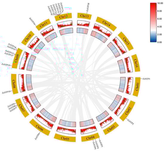 Homology analysis of ZeSTP genes in Z. elliottiana (chromosomes 1–16). Chromosome-scale localization (outer ring); genomic gene density distribution (middle rings); genome-wide synteny blocks (gray connectors).