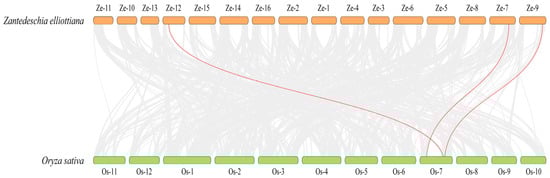 Interspecific collinearity analysis of STP genes between Z. elliottiana and O. sativa. Gray lines indicate collinear blocks between the two species, while red lines represent collinear gene pairs between STP genes of Z. elliottiana and O. sativa.