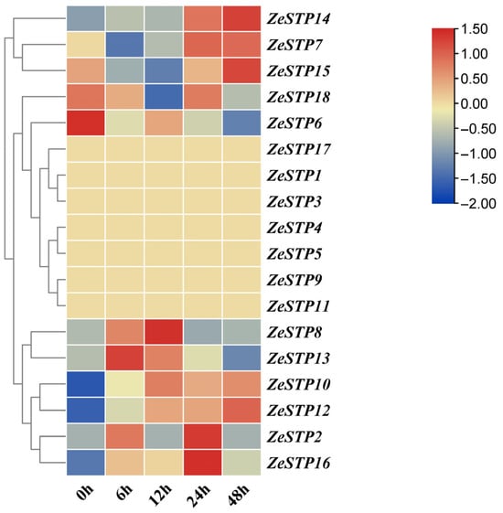In previous studies, the transcriptome data of Z. elliottiana cv. Jingcai Yangguang inoculated with P. carotovora subsp. carotovora was analyzed []. To investigate the response of ZeSTP genes in Z. elliottiana to P. carotovora subsp. carotovora, the expression levels of ZeSTP genes in the transcriptome at 0, 6, 12, 24, and 48 h post-inoculation were analyzed (Figure 7).