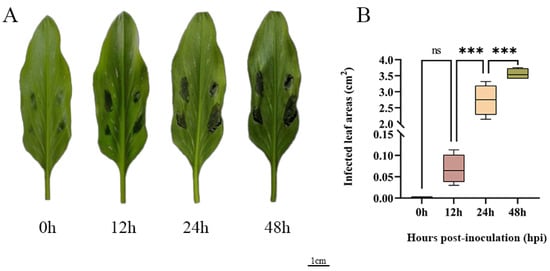 (A) Disease phenotypes at different time points after inoculation of P. carotovora subsp. carotovora on the leaves of Z. elliottiana cv. Jingcai Yangguang. (B) The lesion areas of the leaves after inoculation at different time points (one-way ANOVA: ns: non-significant; *** p < 0.001).