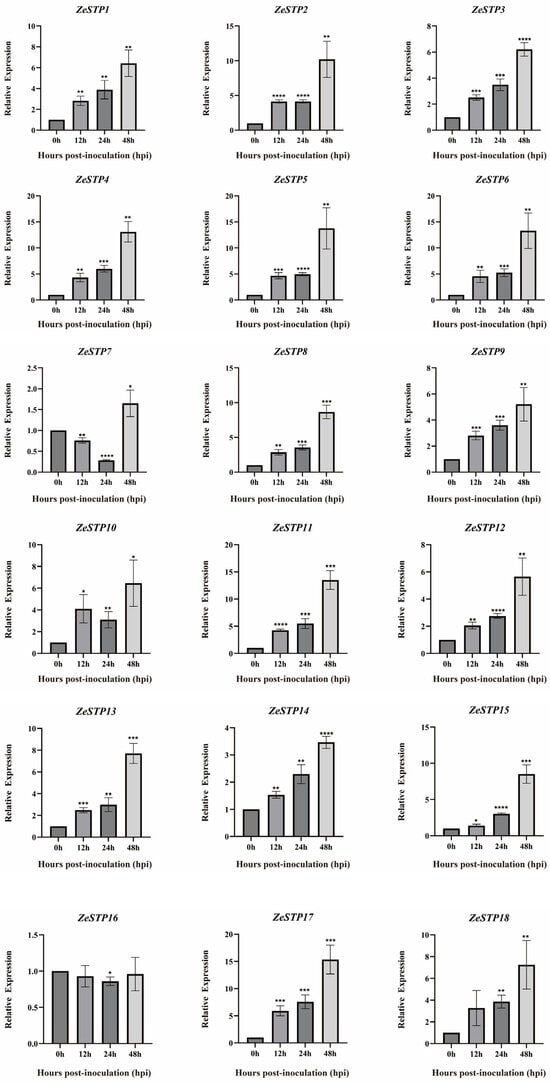 Expression levels of ZeSTP family genes in Z. elliottiana leaves after P. carotovora subsp. carotovora inoculation. Expression dynamics (0–48 h post-inoculation) were quantified by RT-qPCR with gene-specific primers. Data represent the mean ± SE (n = 3); asterisks denote significant differences (Student’s t-test: * p < 0.05; ** p < 0.01; *** p < 0.001; **** p < 0.0001).