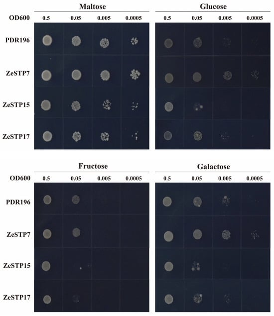 Functional complementation assay of ZeSTP in hexose transporter-null yeast EBY.VW.4000. Transformants expressing PDR196 (empty vector), ZeSTP7, ZeSTP15, or ZeSTP17 were cultured on SD/-Ura medium with 2% maltose, glucose, fructose, or galactose at 30 °C for 72 h.