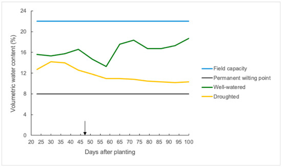 Soil moisture was measured (via access tubes inserted randomly in four droughted plots of each polytunnel and one in a well-watered plot) once a week up to a depth of 50 cm with a time-domain reflectometer (TDR) (TRIME-PICO IPH/T3, IMKO Micromodultechnik GmbH, Ettlingen, Germany). Readings (in the form of percentage volumetric water content) were taken from four depths (20, 30, 40, and 50 cm) from each access tube to calculate the mean soil moisture values in the top 50 cm of the soil profile. Measurements were started three weeks after sowing and continued until physiological maturity.