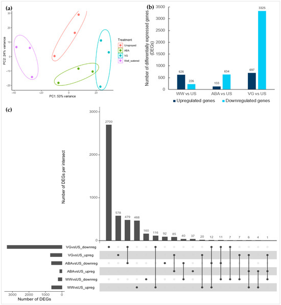 Variation between different anther samples (a), differentially expressed genes in different contrast comparisons (b), and overlapping genes between different contrasts (c). (a) Principal component plot of anther samples showing the maximum and second most variation (PC1 and PC2) between different treatments and their replicates. Ellipses are drawn only to show groups of different treatment replicates; (b) Number of differentially expressed upregulated and downregulated genes (padj < 0.05, log2 fold change > 1 (upregulated), and < −1 (downregulated) in three types of contrasts comparisons (well-watered vs. unsprayed (WW vs. US), ABA vs. unsprayed (ABA vs. US) and VG vs. unsprayed (VG vs. US))) after DESeq2 analysis; and (c) Upregulated and downregulated genes in different contrast comparisons of WW vs. US, ABA vs. US, and VG vs. US samples. The plot shows the number of upregulated and downregulated DEGs that overlap across different contrast samples in intersects. The vertical bars represent the number of either upregulated or downregulated DEGs in each intersect, with the filled circle below showing which contrast sample it belongs to, while the horizontal bars represent the total number of either upregulated or downregulated DEGs for that sample.