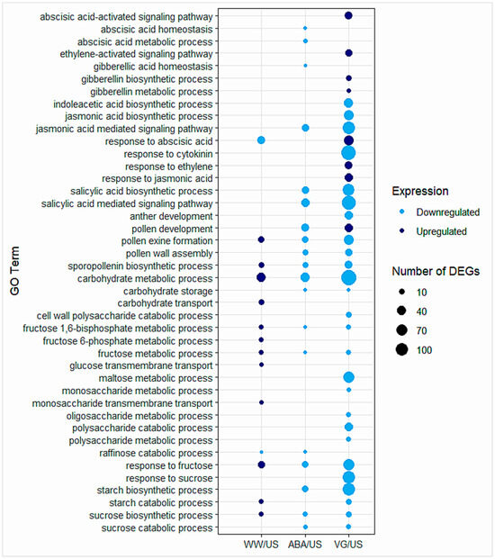 GO terms enriched for biological processes related to hormones, pollen/anther, and carbohydrate- or sugar-related processes in three contrast comparisons of well-watered, ABA, and VG (droughted)-treated plant anthers in comparison to unsprayed. Dark blue represents the GO terms enriched for upregulated genes, and light blue represents the GO terms enriched for downregulated genes. The size of each circle depicts the number of differentially expressed genes (DEGs) enriched for the GO term. More details on GO terms enriched for various biological processes can be found in Tables S3 and S4.