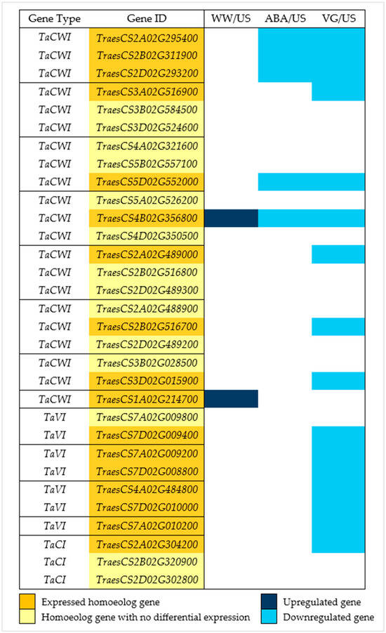 Invertase genes differentially expressed in well-watered, ABA, and VG (droughted)-treated plant anthers compared to unsprayed plant anthers. Dark blue represents upregulated genes, and light blue represents downregulated genes (padj < 0.05, log2 fold change > 1 (upregulated genes), and <−1 (downregulated genes)). Golden yellow represents the expressed homoeologs genes (in different contrast samples) in 13 homoeolog gene groups separated by a solid black line, with depiction of homoeologs genes that were not differentially expressed in light yellow. TaCWI represents cell wall invertase genes, TaVI represents vacuolar invertase genes, and TaCI represents cytoplasmic invertase genes.