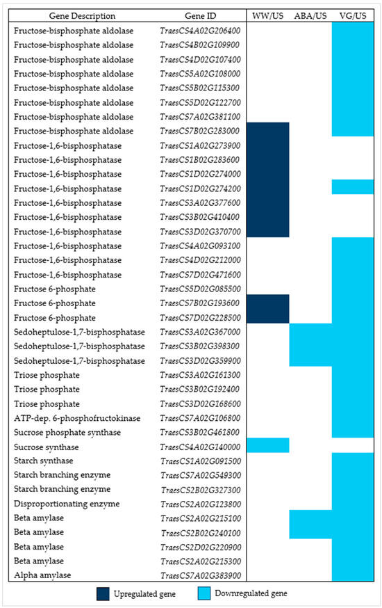 Sucrose biosynthesis genes and nine starch-related genes that were differentially expressed in different anther samples of three contrast comparisons (well-watered, ABA, and VG (droughted)-treated plant anthers compared to unsprayed ones). Dark blue represents upregulated genes, whereas light blue represents downregulated genes (padj < 0.05, log2 fold change > 1 (upregulated genes), and <−1 (downregulated genes)).