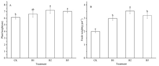 As shown in Figure 1A, the average shoot heights of the CK, B1, B2, and B3 seedlings were 6.13, 6.63, 7.20, and 7.03 cm, respectively. The shoot height of the B2 and B3 seedlings differed significantly (p < 0.05) from the shoot height of CK seedlings. However, no significant differences were detected among the shoot heights of the treated groups. As shown in Figure 1B, the B1–B3 groups exhibited significantly higher (p < 0.05) shoot fresh weight than the CK group (49%, 77%, and 60% higher, respectively). Furthermore, only mild differences were observed between the shoot fresh weight of the B1 and B3 groups; however, the shoot fresh weight of these groups was significantly lower than that of the B2 group.