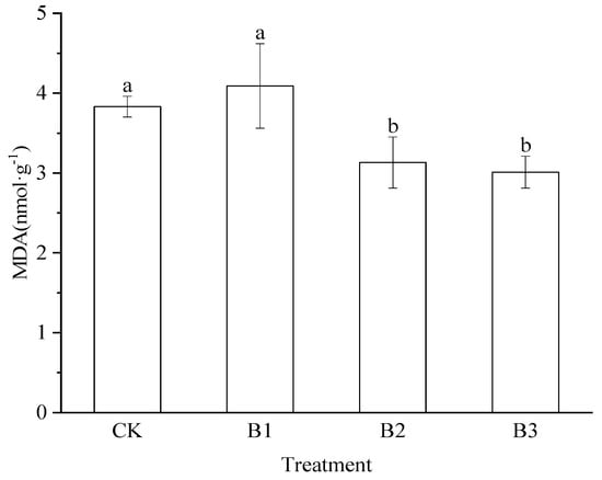 MDA content of the groups ranged from 3.01 to 4.09 nmol/g (Figure 2). The MDA levels in the B1 group were comparable to those in the CK group but significantly higher than the levels in the B2 and B3 groups. The MDA levels in the B2 and B3 groups were comparable to each other but significantly lower than those in the CK group (p < 0.05).